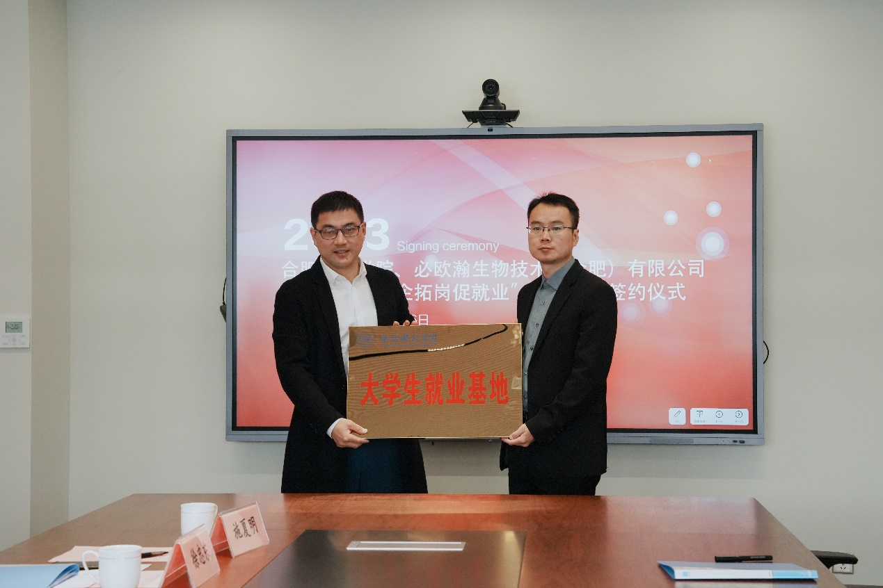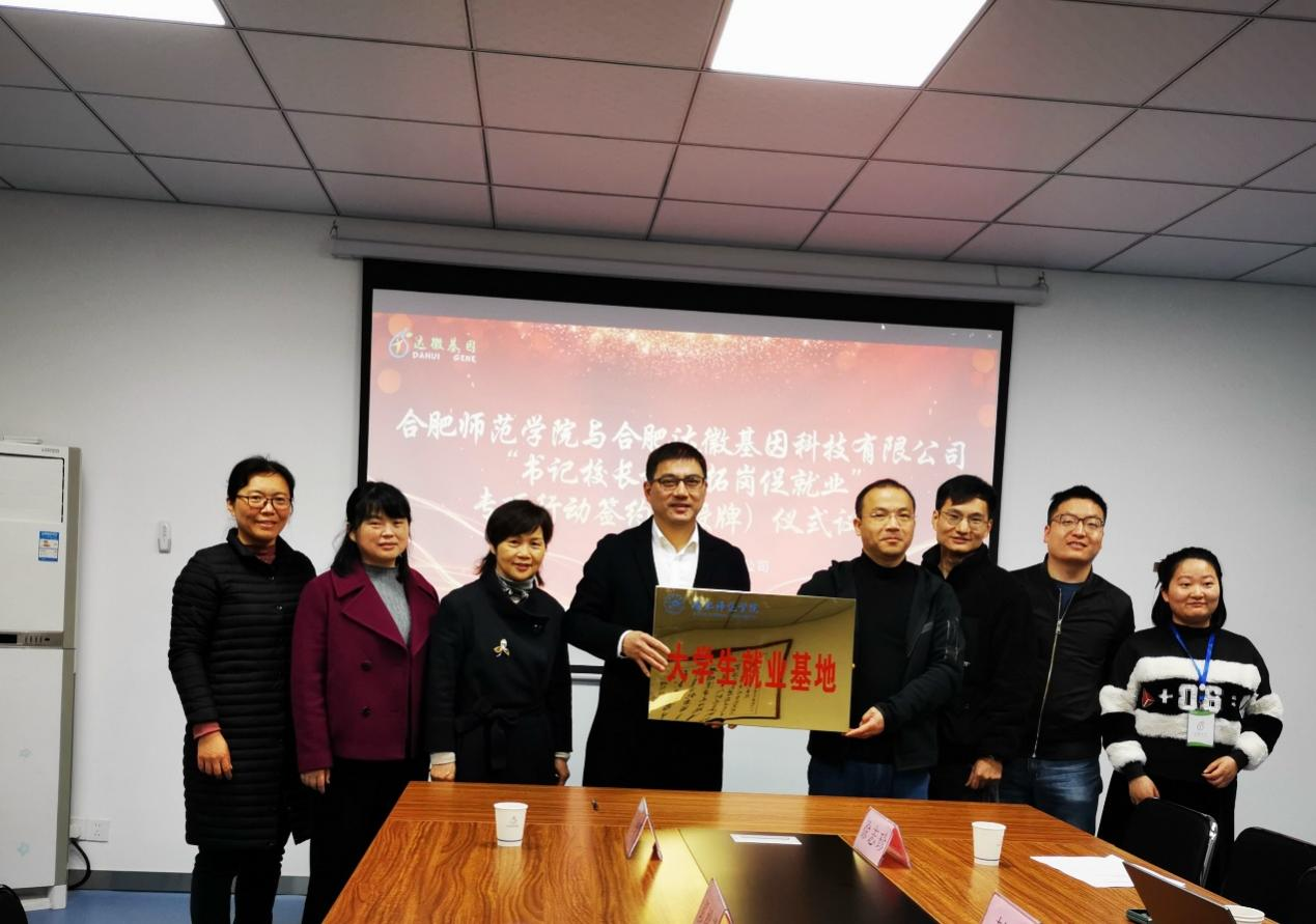 座谈会后,分别与各家公司举行了共建实习就业基地签约和授牌仪式。周端明为四家公司进行了合肥师范学院大学生就业基地授牌。郭桃芬、徐忠东分别代表生命科学学院与四家公司签订了实习就业基地协议。