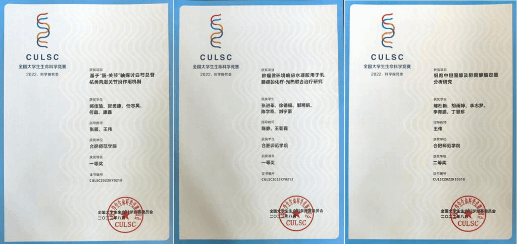 本网讯 8月22日-24日,全国大学生生命科学竞赛,科学探究类决赛在安徽农业大学主会场、东北师范、中山大学、西华大学分会场成功举办。我校生命科学学院通过校内选拔,3支代表队晋级国赛,通过视频汇报、线上答辩、评委线下现场打分环节的激烈比拼,张雁、王伟指导的《基于“肠-关节”轴探讨白芍总苷抗类风湿关节炎作用机制》(团队成员:郝佳瑜、张勇康、任志吴、何璐、康鑫)和陈静、王朝霞指导的《肿瘤微环境响应水凝胶用于乳腺癌的化疗—光热联合治疗研究》(团队成员:张进莘、徐德福、邹明娟、陈学奇、刘宁豪)两个项目斩获全国一等奖(最高奖项);王伟老师指导的《细胞中胆固醇及胆固醇酶定量分析》(团队成员:陈桂艳、胡丽婷、李志梦、李育鹏、丁慧珍)荣获全国二等奖,实现了我校大学生生命科学竞赛成绩的历史突破。