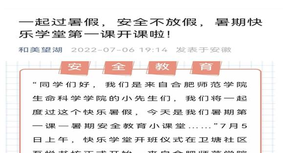《学习强国》、《人民网》、《中国青年网》等国家级媒体相继报道学堂的开设情况,《安徽日报》、《掌中安徽》、《合肥晚报》等媒体报道了学堂日常生活情况。“喜迎二十大”爱国教育和暑期防溺水主题教育经合肥电视台进行采访,并于《晚间播报》、《早安合肥》等新闻频道、腾讯视频平台进行播放。此外,微信公众平台《美望湖》、《合师生科》也对学堂进行了宣传报道,该学堂共被各家媒体报道14次。