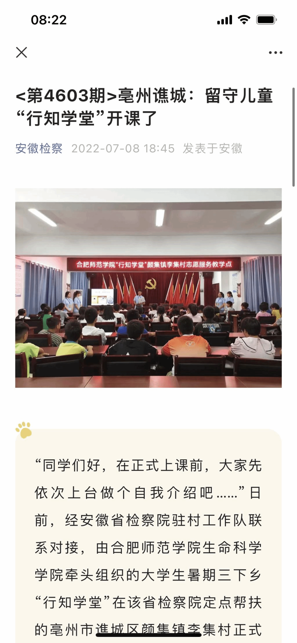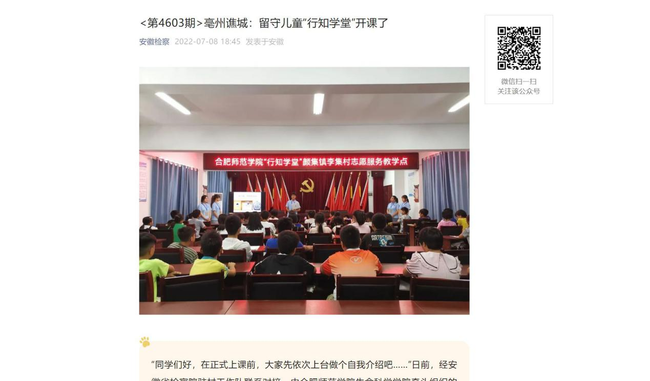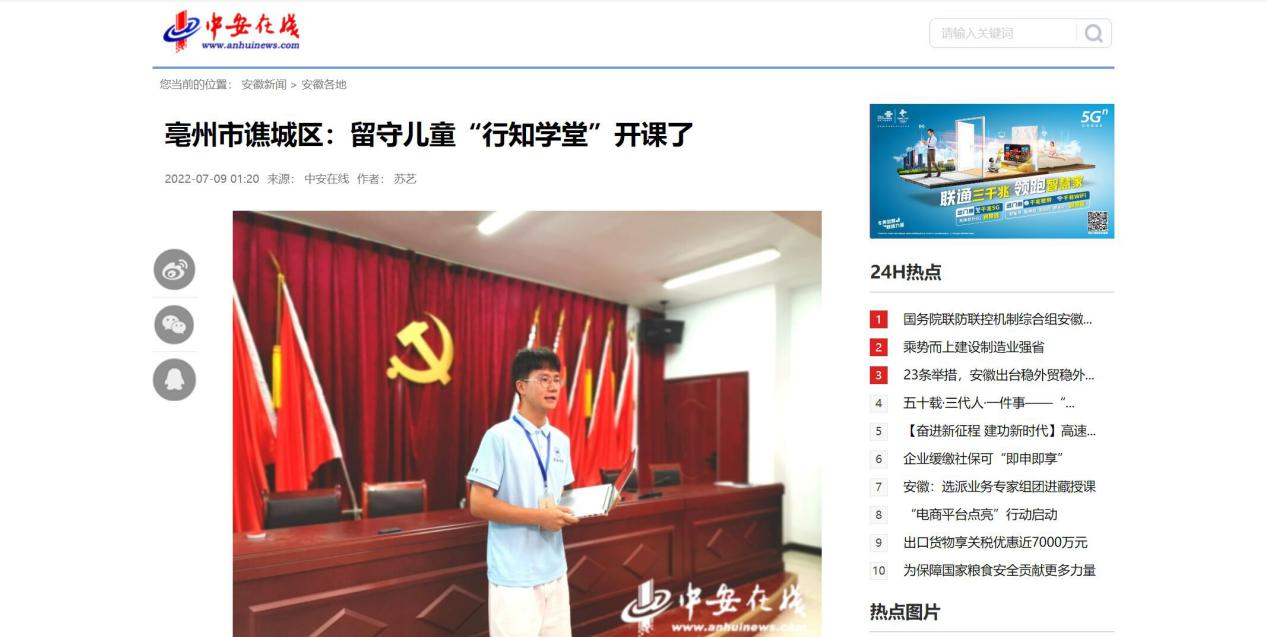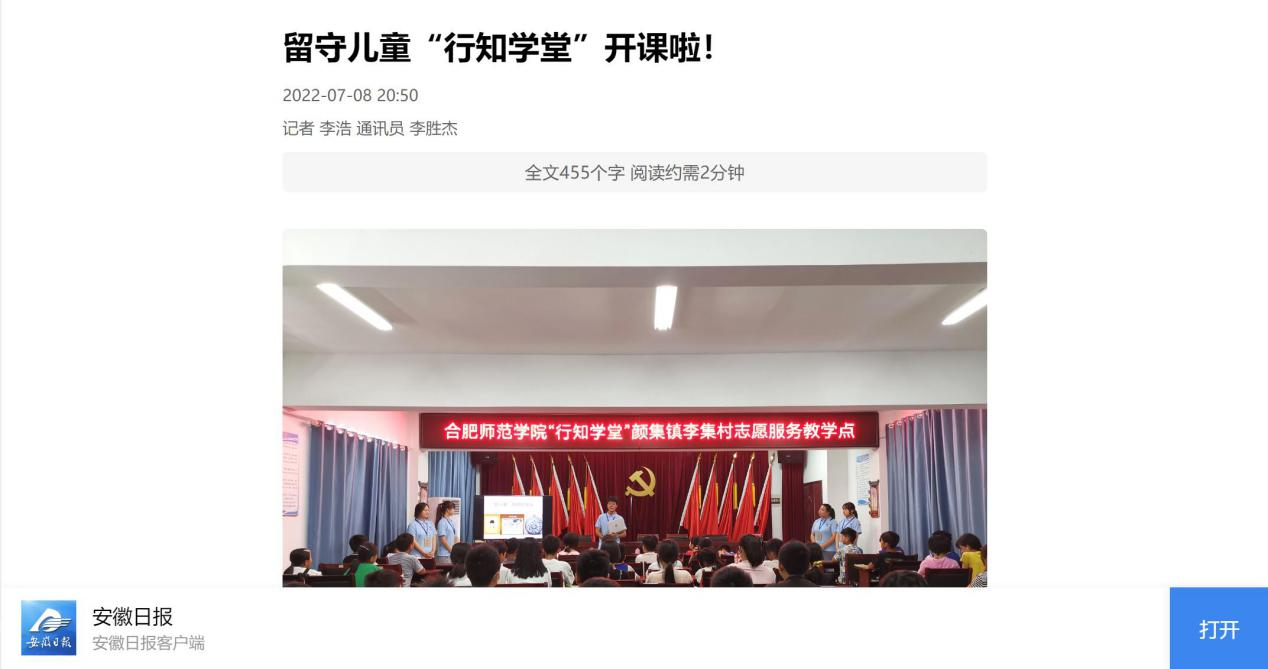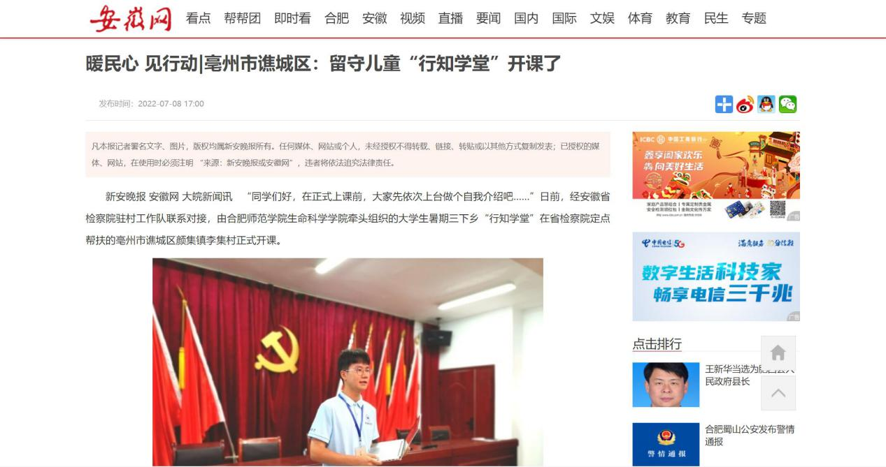 《安徽日报》、《新安晚报》《中安在线》等媒体报道生命科学学院亳州市谯城区留守儿童“颜集行知学堂”