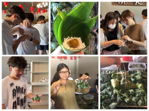 活动现场,桌上大大小小的盆里盛满了粽叶、糯米、大枣、腊肉、红豆等食材,同时也盛满了同学们的喜悦。大家根据提前学习的教学视频,有模有样的开始折叠粽叶,填放食材,包裹成型,扎紧绳索,一颗颗饱含祝福的粽子相继诞生。同学们纷纷与自己的劳动成果合影留念,收获劳动的快乐,脸上洋溢着自豪的笑容,现场气氛其乐融融。