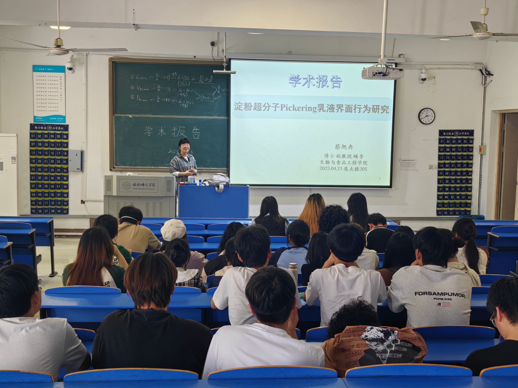 2025年4月23日下午,beat365正版唯一官网在锦绣校区逸夫楼205教室举办学术讲座,学院教师蔡旭冉分享了“淀粉超分子Pickering乳液界面行为研究” 的主题报告。