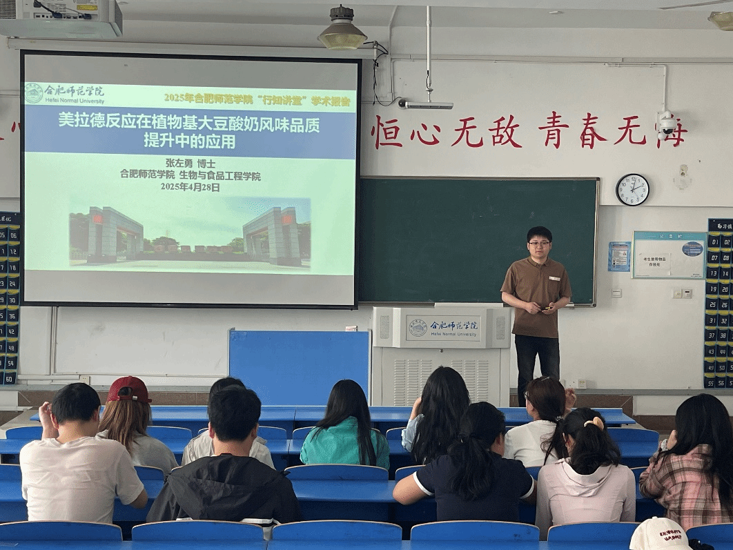 4月28日下午,beat365正版唯一官网张左勇博士在锦绣校区逸夫楼A306教室作题为《美拉德反应在植物基大豆酸奶风味品质提升中的应用研究》行知讲座。学院副院长陈金武教授现场指导,食品质量与安全专业学生代表参加了此次报告。