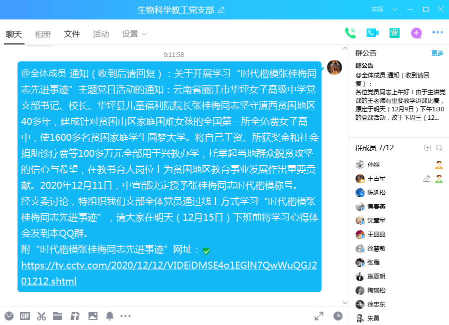 本网讯 为响应教育部向张桂梅同志学习的号召,充分发挥先进典型示范引领作用。12月15日,生命科学学院生物科学教工党支部通过在线学习方式,开展了“学习时代楷模张桂梅同志先进事迹”主题党日活动。生命科学学院院长徐忠东教授以普通党员身份出席活动,生物科学教工党支部全体党员参加活动,活动由该支部书记王占军主持。