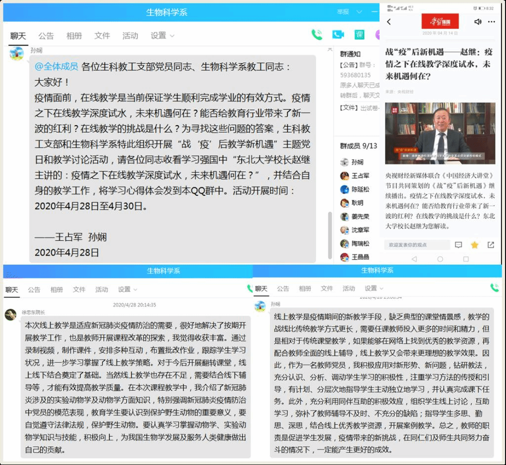 本网讯4月28日至30日,生物科学教工党支部联手生物科学系利用学习强国平台中“东北大学校长赵继主讲的:疫情之下在线教学深度试水,未来机遇何在?”,开展了“战‘疫’后教学新机遇”主题党日和教学讨论活动,活动由生物科学教工党支部书记王占军和生物科学系主任孙娴共同组织,生物科学教工党支部党员和生物科学系全体教师参加。