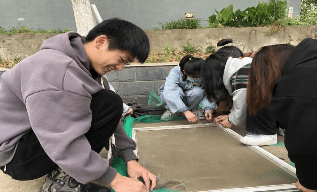 事前,各年级辅导员对纱窗破损寝室进行了统计,学院根据寝室数准备窗纱。5月1日上午,各寝室将破损的纱窗取下带到场地,排队等待更换。各支部党员和发展对象有序分工,按各班统计数据核实登记,拆卸旧窗纱、剪裁新窗纱、压条、整理。有的同志对更换窗纱技术并不熟练,但他们边学边干,积极主动,以饱满的热情投入到工作当中,最终,顺利完成了所有学生寝室破损窗纱的更换工作。
