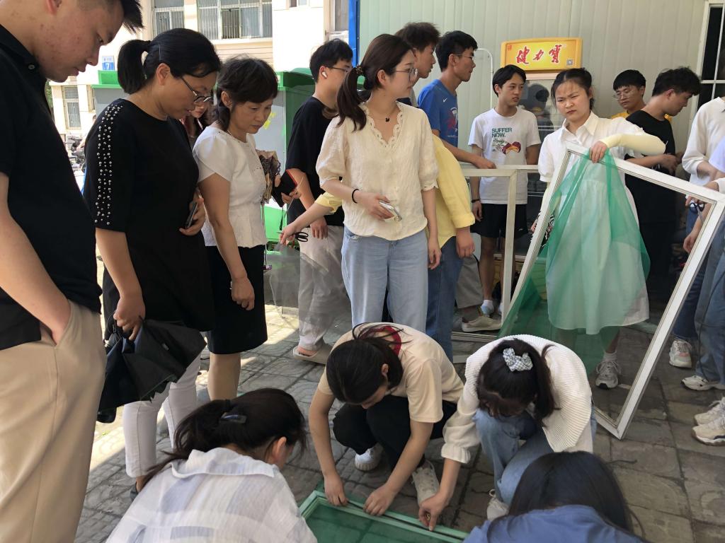 各寝室将破损的纱窗取下带到宿舍楼下排队,等待更换。学生党员有序分工,按之前统计的表格核对登记,拆卸旧窗纱、剪裁新窗纱、压条、整理。这些党员对更换窗纱并不熟悉,边干边摸索,满头大汗、手指划破,依然任劳任怨,成功完成生科院学生宿舍破损窗纱的更换工作。