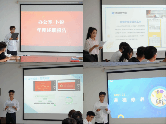 会上,主席团成员和六个部门的主要负责人逐一述职。主席团成员简要回顾了学生会过去一年来的各项工作,包括活动策划和组织、学生代表的培养、各个部门的协调合作等方面,并从思想、学习和工作方面进行了自我总结、分析和反思。六位部门负责人结合自己负责的领域介绍了过去一年的工作成果和季度计划,分享了学生会工作中的体会和成果以及个人的成长收获。评委老师和学生代表根据述职内容和日常工作情况对参与述职的人员进行评议和打分。