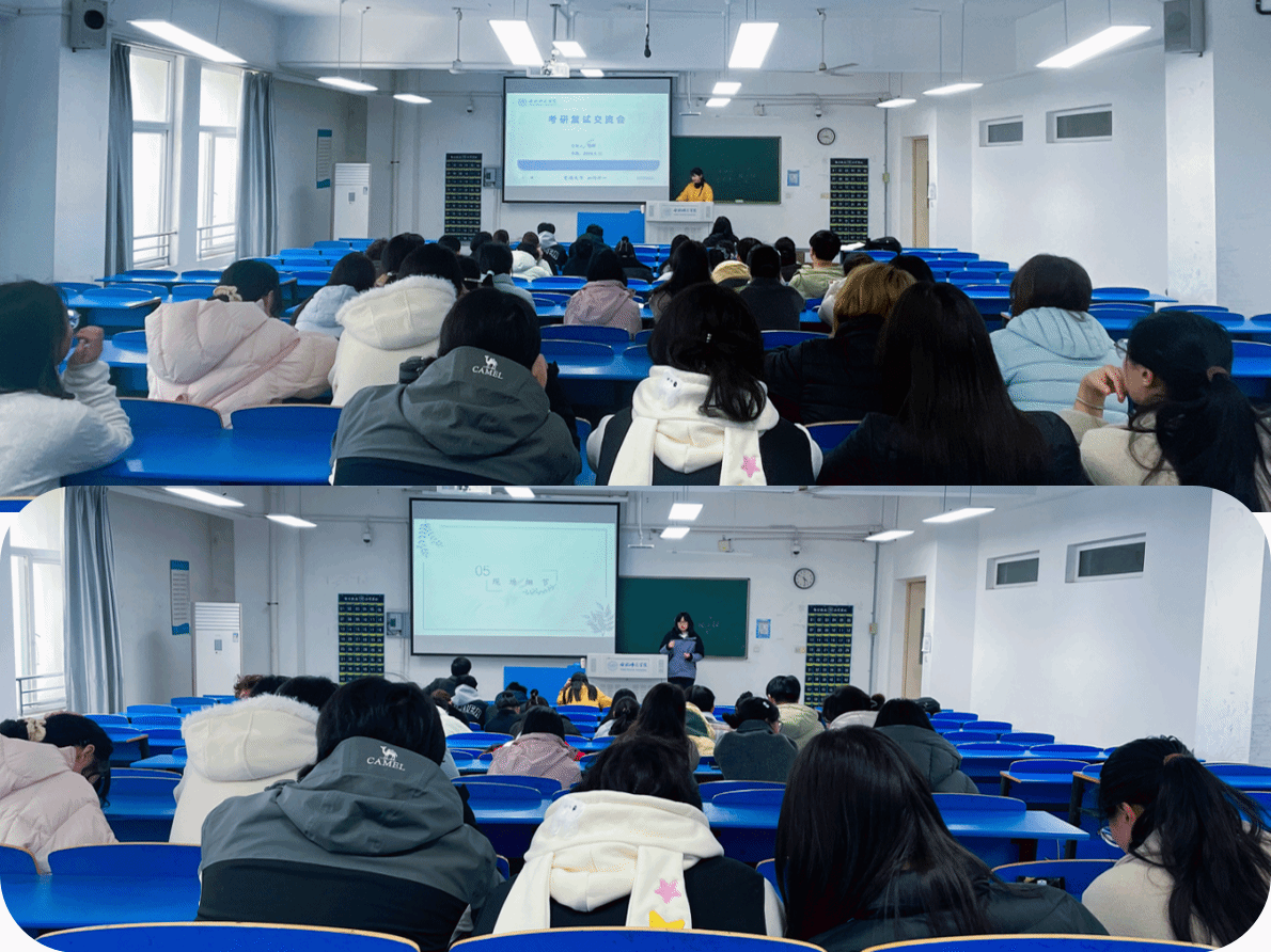讲座围绕“复试前的各项准备工作”展开讲解,包括复试流程梳理、材料准备、专业知识复习、英语口语训练等方面进行了系统介绍;聚焦“复试过程中的注意事项”,通过模拟场景和典型案例,生动讲解了面试礼仪、答题技巧、应变能力等关键要素;围绕“调剂策略”进行深入剖析,结合近年来考研调剂形势,分析了调剂政策、信息获取渠道、院校选择技巧等内容;围绕复试期间的身心健康与安全事宜进行了温馨提醒,鼓励同学们保持平和心态,注意人身和财物安全,特别强调要警惕“复试包过”等骗局。同学们纷纷表示,此次讲座不仅让他们对复试有了更清晰的认识,也增强了应对复试的信心与底气,更感受到了学院的温暖与鼓励。