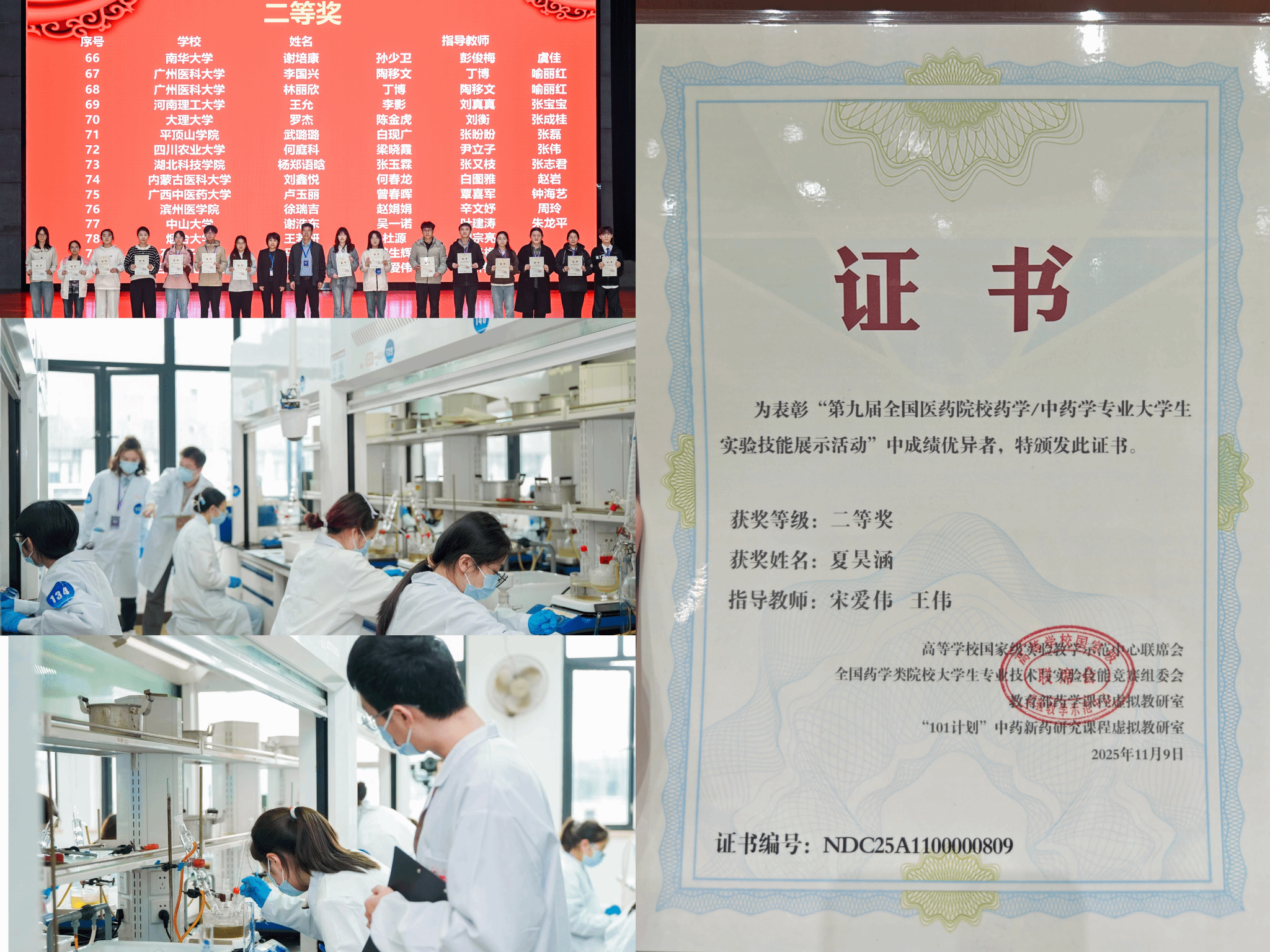 近日,由教育部高等学校国家级实验教学示范中心联席会、全国药学类院校大学生专业技术与实验技能竞赛组委会、教育部药学课程虚拟教研室和中国药科大学共同主办,中国药科大学承办的“第九届全国医药院校药学/中药学专业大学生实验技能展示活动暨实验、实践教学研讨会”在江苏省南京市隆重举行。beat365正版唯一官网23级生物制药班的夏昊涵同学凭借扎实的专业知识和出色的实验操作技能,在理论知识考核和实验技能展示等环节表现优异,最终取得全国二等奖的好成绩。